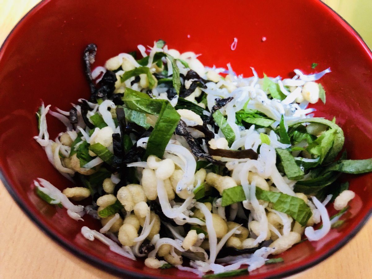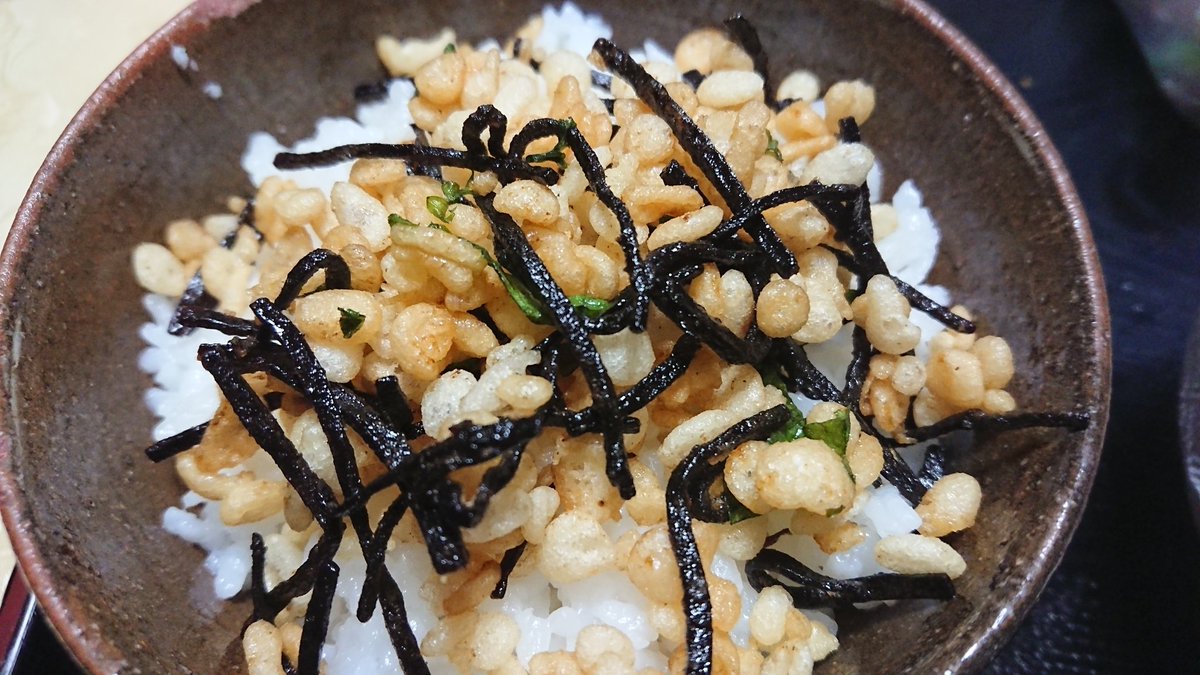かや On Twitter うちの母が職場で聞いてきた悪魔の食べ物なんだけど 揚げ玉と大葉と塩昆布を麺つゆちょっとで混ぜてご飯の上に乗っける と延々と炭水化物を摂取してしまうからみんな悪魔と契約した方が良いよ