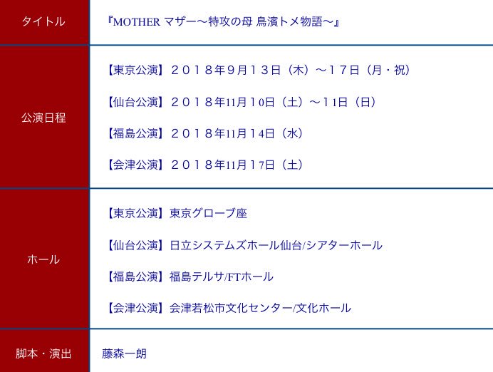 一村すみれ On Twitter お知らせ 舞台 Mother マザー 特攻の母 鳥濱トメ物語 出演させていただきます 9月13日 9月17日 東京グローブ座 仙台公演 福島公演 会津若松公演も決定してます 詳細 Https T Co Rg7qvaijpo 全力で精一杯努めてまいります